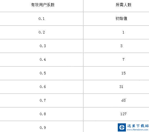 1、每天初始有效用户系数为0.1,此后每增加0.1,需要的有效用户数以2的指数增长。