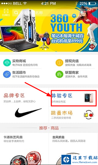 1、打开app,在【商城】页面,选择【体验专区】一栏进入;