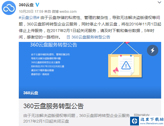 由于云盘存储的私密性、管理的复杂性,导致无法解决盗版侵权等问题,360云盘即将转型企业云服务,同时停止个人版云盘,将在2016年11月1日起停止上传服务,在2017年2月1日起关闭服务,请及时下载和备份数据,5年时间,感谢您的一路相伴。