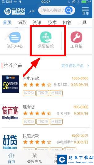 1、首先,打开云投贷app,在主页里点击箭头所指的我要借款位置!