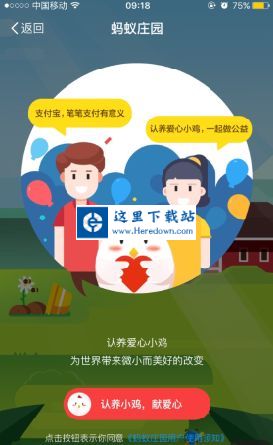 1.进入到“蚂蚁庄园”页面,如果用户是第一次进入蚂蚁庄园,这时会弹出一个页面,然后在此页面点击“认养小鸡,献爱心”按键。