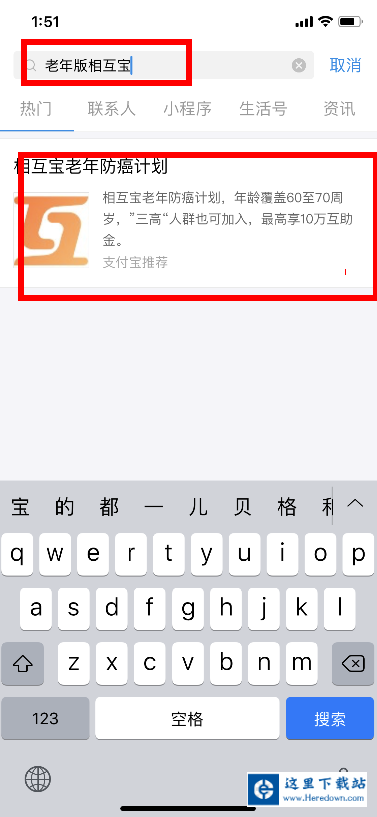 1.打开支付宝app,直接搜索老年版相互宝,如下图所示: