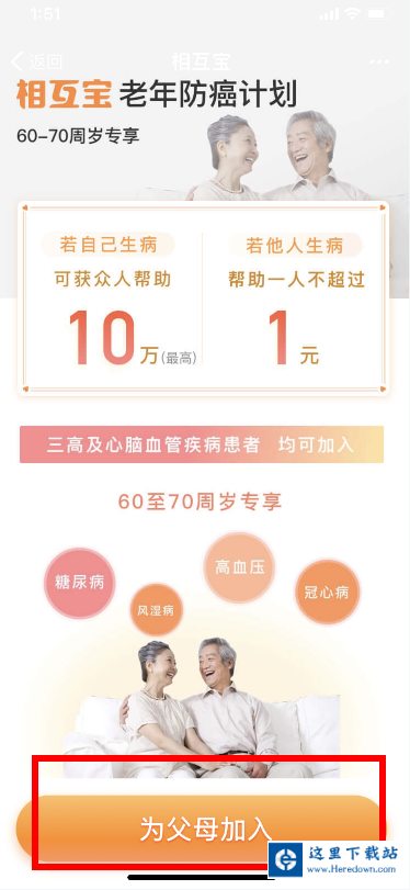 2.然后点击相互宝老年防癌计划,申请为父母加入