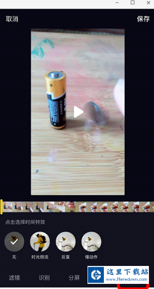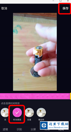 按住“时间倒流”特效即可倒放,然后点击“保存”,最后发布即可。
