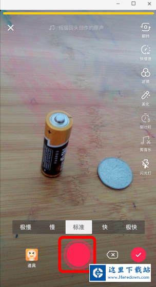电池放旁边,转动硬币,点击“红色圆圈”开始拍,手指放在硬币上方,硬币停止转动后拿起电池,摩擦手指。