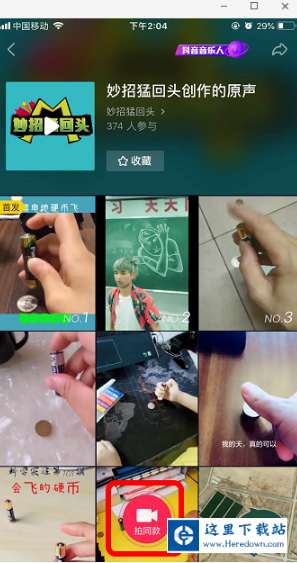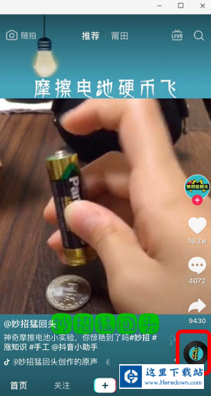 打开抖音,如果刷到摩擦电池转硬币的视频,并且想用同款音乐,可以点击“圆圈 ”,也可以点击“+”,自己选择音乐。