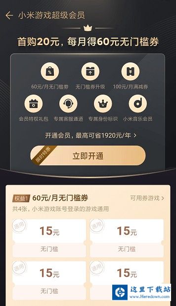 2、点开“小米游戏超级会员”,我们看到如下图所示的界面,点击“立即开通”,就可以正式成为超级会员啦!