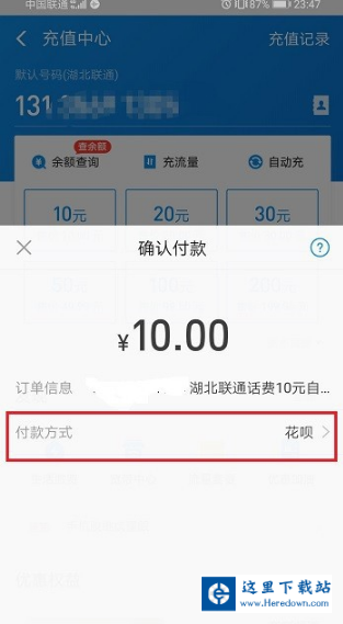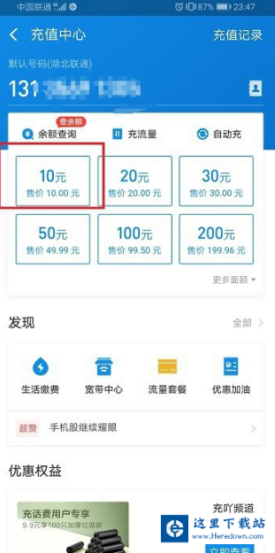 第三步选择好手机号之后,选择要充值的金额,这里选择10元,如下图所示: