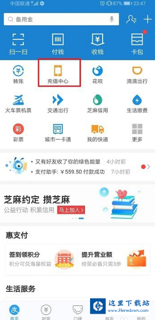 第一步在我们的手机上打开支付宝,进去首页之后,点击充值中心,如下图所示: