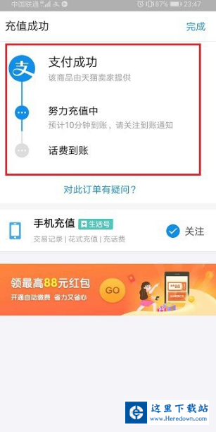 第五步验证密码之后,可以看到已经使用花呗支付成功了,等待话费到账,如下图所示: