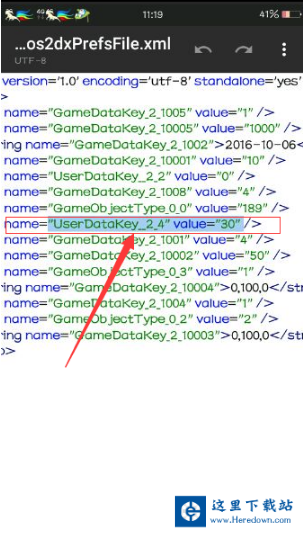 5、打开Cocos2dxPrefsFile.xml ,标示的那一行意思就是用户的金币价值是多少,我们之前的是30