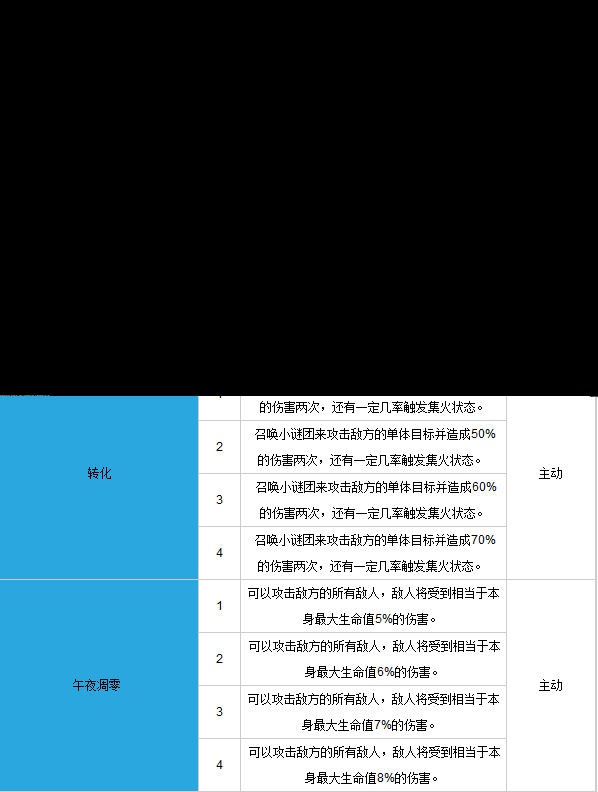 召唤小谜团,攻击敌方单体目标,造成40%攻击力的伤害2次,有几率触发集火