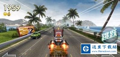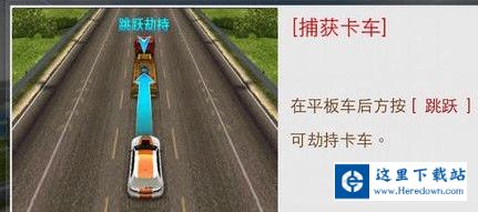 2、跳上卡车能让玩家在一段时间内处于无敌状态、速度也会加快,而且不费汽油,通过卡车去撞击道路上的汽车还会有积分哦!因此劫持卡车也是提高分数的一个重要的手段。