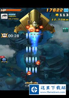 3、其实游戏第一关难度不大,飞机都比较好打,只要注意控制飞机躲避就好,否则躲避不及时,被敌机碰撞两下玩家就GAME OVER了,在游戏过程中,玩家打爆敌机会爆出一些道具,例如磁铁,防御护罩,或是短时间增加杀伤性的弹药道具(四蓝弹连发),因此在道具的帮助下,除开BOSS以外的敌人都是菜,玩家不用放在心上。等到玩家飞行差不多12KM里的时候,敌人BOSS就会出现,这时候系统也会提示,虽然是BOSS(看样子好像是隐形战机),但是对付它是很简单的,这个BOSS只会四弹分散性攻击,然后在它身上还有两门火炮,是不定向攻击,因此很容易在BOSS的炮火空隙下对BOSS发动攻击,只要玩家反应不是太过于迟钝,那么第一关是轻松度过,BOSS从出现到爆炸只需要10秒就可以解决,因此玩家找到技巧,就不会感觉到有压力了。