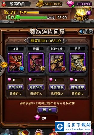 魔能风暴中每4小时刷新四张碎片,玩家每天可免费领取一张,如当前刷新碎片中无玩家所需碎片,可选择直接刷新或等待刷新剩余时间结束。如果选择直接刷新,那么玩家需要消耗40魔钻。消耗魔钻刷新后,除了当前可兑换碎片立即刷新以外,玩家还能获得10卡魂。