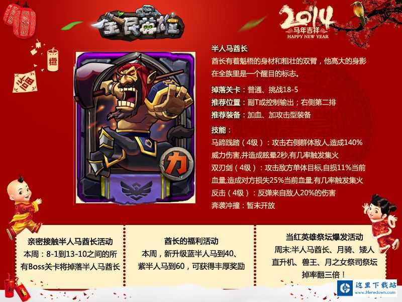 《全民英雄》“一马当先,勇往直前”迎马年特别活动,已于1月13日起正式开启。即日起至1月19日期间,原本只在“18-5”关卡掉落的“半人马酋长”英雄卡牌,将在“8-1”至“13-10”之间的所有Boss关卡掉落,玩家挑战关卡就有机会将这位“酋长”带回家。拥有“半人马酋长”后,玩家升级蓝卡半人马酋长至40级,或将紫卡半人马酋长提升至60级,均可获得金币、绵羊、装备等丰厚奖励,尽享酋长奉献的超级福利。