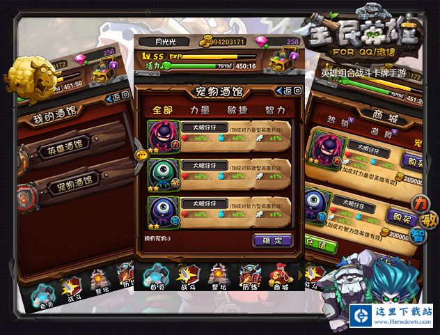 《全民英雄》在卡牌收集、养成、闯关等基础玩法上,加入了装备系统、装备合成、专属技能、集火系统、速度属性等可玩性更高的内容。增加宠物系统后,玩家在战斗时,宠物会在阵容左侧或右侧上下浮动,给你加油打气。宠物自带技能,且皆为被动技能,在战斗中有几率触发释放,可强大己方英雄,也可挫伤敌方。宠物无HP、MP等属性,不用担心宠物在战斗过程中死亡。在战斗中,宠物只会给你带来意想不到的惊喜,完全不会成为你的“负担”。