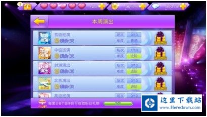 除了全国巡演,你还可以选择“本周演出”系统;作为类似限时副本形式的系统,你可以额外选择一些特殊要求难度的关卡,体验更刺激的挑战。