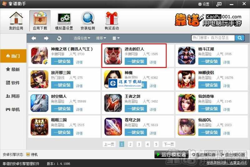 3、打开靠谱助手(标准版)-- 应用下载 -- 点击安装“进击的巨人”游戏