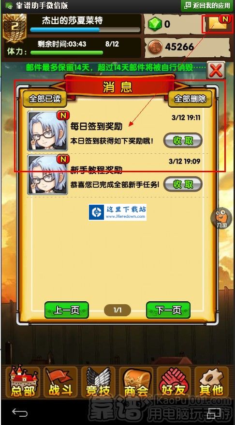 ⑤进入游戏 -- 过新手教程 -- 点击签到 -- 点击右上角邮箱 -- 领取签到奖励