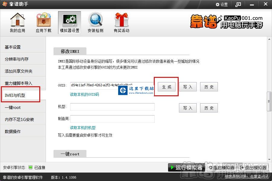 ①关闭游戏,返回靠谱助手,点击模拟器设置 -- IMEI与机型 -- GUID点击生成 -- 点击写入