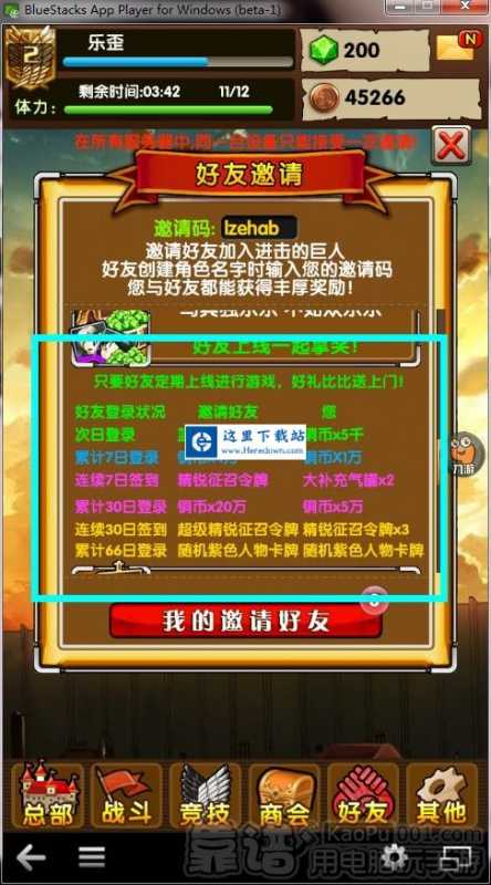 7、这些奖励都需要邀请好友来参加,例如:邀请好友连续登录7天,登录时输入你的邀请码,即可获得铜币*4W。如果没有那么多好友,那么,就需要创建自己的小号来帮助你完成这些任务: