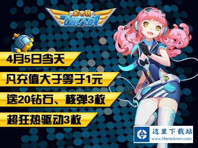 活动说明:凡单次充值大于等于1元,即能额外获得20钻石、核弹3枚、超狂热驱动3枚,活动期间每人只能领取一次奖励。