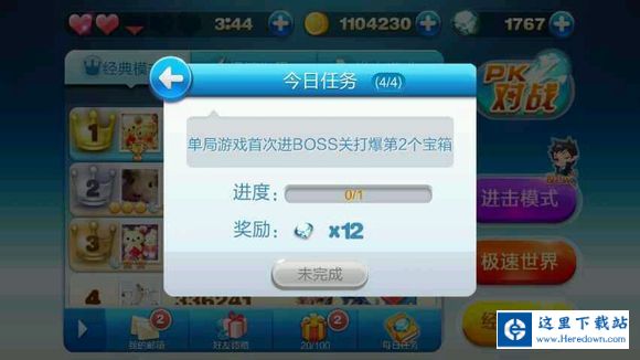 单局游戏首次进BOSS关打爆第2个宝箱,这个任务只要把你常用的那个人物忍痛花50钻石将攻击力升到第五级就行,亲测n遍刚好完美打爆第二个boss宝箱,大家不要相信那些点了几级钻石的说什么要最少升到7级8级11级之类的谎言。