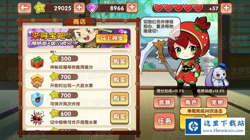 除了有角色的加入以外,切水果中还有宠物系统,宠物能使游戏加分大幅提升,而且宠物可是有叠加的加成,拥有宠物越多,得分提升越高。在传统的《水果忍者》中我们可以进入道场更换刀刃,而《全民切水果》更是将刀刃变为了武器,武器可以提高连击得分和所有水果的得分。