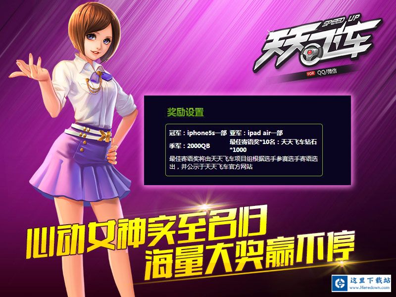 飞车女神评选活动第二季的奖品依然给力,冠军的奖励是iphone5s一部;亚军的奖励是ipad air一部;季军的奖励是2000QB。相信有了这些大奖助力,美女们玩起飞车来肯定是更加的过瘾,闯关、刷分、抢占排行榜通通都变得更加容易。不知道最后会是哪位美女能够赢得众多飞车迷们的亲睐,将大奖捧回家呢?