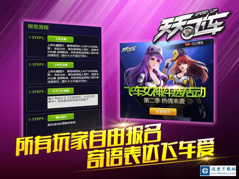 活动期间,所有女性玩家均可通过游戏活动页面跳转报名页面或天天飞车官方微信参与报名。玩家报名需上传头像一张、生活照一张,并输入自己对《天天飞车》游戏的寄语。让我们一起晒靓照,送祝福,比拼创意,比拼人气!活动奖励也非常诱人,最佳寄语的十名获得者将收获上千钻石的奖励。此外,评选出的女神冠军将有机会出现在所有飞车玩家的面前为大家带来视频教学,并有可能成为下一期主题活动的主角哦!