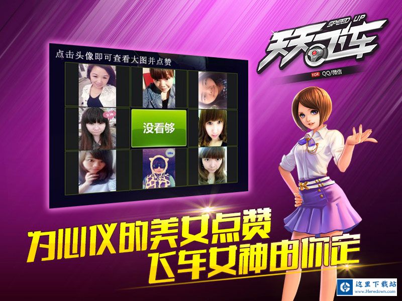 众多飞车美女热情晒照的同时,飞车帅哥们也不甘示弱。活动期间,每位飞车玩家每日可以给5位不同的女神点赞。点击选手头像就可以查看到这位女神的照片,点击活动页面上的“没看够”就会刷新一批新的美女头像出来。不要看傻眼就忘记点赞了哦,飞车女神由你热捧,赶紧去选出自己最爱的女神吧!