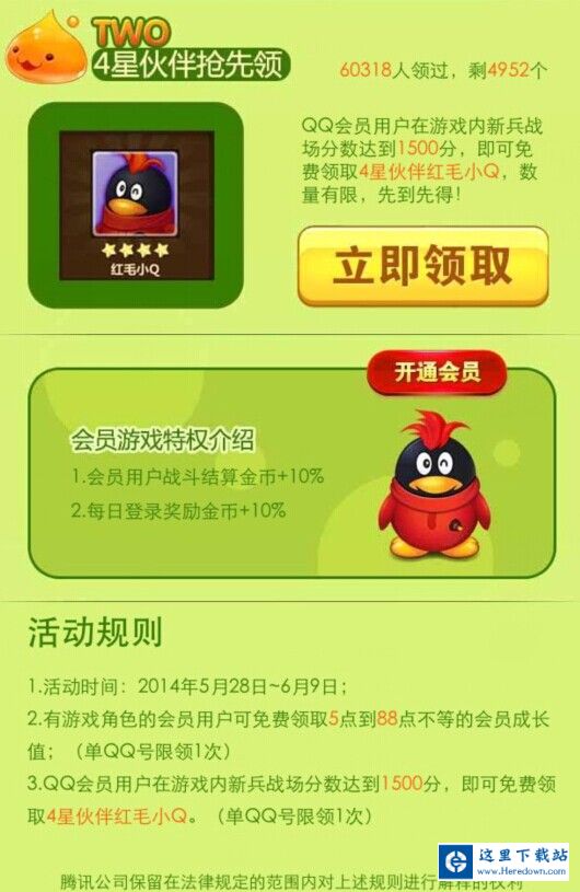 QQ会员用户在游戏内新兵战场分数达到1500分,即可免费领取4星伙伴红毛小Q(单QQ号限领取一次)
