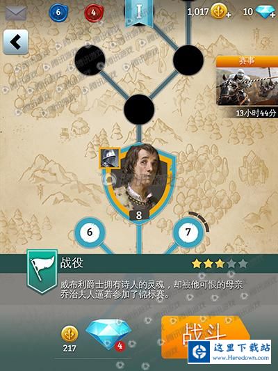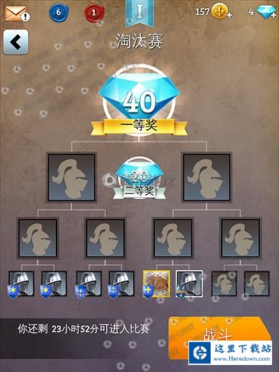 《骑士对决》目前可以在AppStore中国商店免费下载。在游戏中玩家可以赢比赛来赚金币和少量钻石,原本以为游戏中装备和升级会是钻石的最大消耗点,但试玩后发现体力才是最短缺的。仅仅是剧情模式中的山丘之王赛,因为要求连胜三场否则重来,就足够快速消耗玩家的体力了。锦标赛同样如此,初始的6点体力是毫无希望去争取什么名次的。即便你可以加好友索取体力,但由于两次索取之间要间隔几个小时,所以要玩爽,看来还是得充点钱了。不过如果你能耐着性子每天就玩几把,不付费也是可以享受到游戏乐趣的,普通剧情模式中的金币足够应付一般装备和升级了。