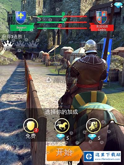 在每一场骑士对决中,胜负取决于对战双方的铠甲值、速度值、攻击值。铠甲值主要通过购买和升级装备来提升,速度值则由马匹的素质和冲锋时的QTE结果决定,攻击值除了看长矛的杀伤力外,还受玩家戳刺目标的准确程度影响。游戏就像田忌赛马一样,三大数值中两条占优者获胜。除了上面说的装备和主动操作影响外,玩家也可以在赛前购买属性加成,当然这个就属于付费服务了。