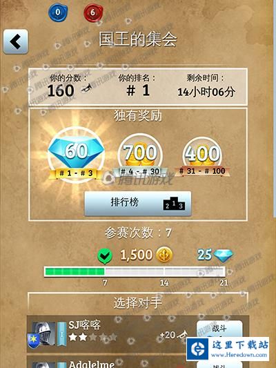 游戏共有三大模式:剧情模式、锦标赛模式、淘汰赛模式。剧情模式需要消耗皇家印章来推进,也就是体力设定了。剧情模式中有多种比赛,像普通的对决、有装备赞助的对决、要连胜三局的山丘之王赛、要求三局两胜的BOSS战等,玩法非常丰富。另一方面挑战赛需要消耗社交印章,挑战赛虽然是与其他玩家对战,但不是即时的。玩家们通过战胜对手攒积分去赢奖励。淘汰赛模式是最让人难理解的,八人制的淘汰赛需要10钻石的报名费,报名费将全部返还前三名的胜者。笔者参加了一次淘汰赛,进行一次冲锋之后,居然要24小时才能获得胜负判定……24小时候笔者被判负,也没有给出更多说明,这个淘汰赛非常坑爹,是游戏的一大败笔。