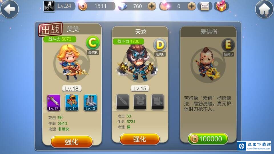 除了爱佛僧为最高S级英雄外,美美和天龙都是最高为B级的英雄。英雄需要从最低E级强化逐渐强化到高级,品质高的英雄属性更高,技能越多。