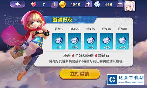 邀请好友:邀请手Q或微信里的好友加入游戏总共可以获得93钻,一共需要80个好友,好友不够的话可以去手游宝论坛或者QQ群里发交友贴,一般很快就能攒齐80个好友,把钻石抱回家了,基本上属于动动手就白拿的差事。