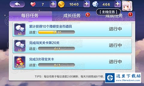 1、每日任务:每日任务每天只能完成6次凌晨2点更新,其中5个能获得5个钻石,1个能获得3000金币,相当于每天有25钻固定产出。
