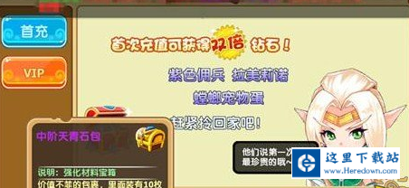 2.首充礼包。首次充值可以获得3个卓越幻之钢包,一共可以获得30个卓越幻之钢,另外还有紫色佣兵契约、A级螳螂宠物蛋和中阶天青石。