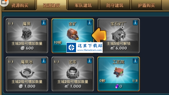 2、金矿:金矿能产出金币,升级金矿能提升金币产出速率和增大金币暂存库容量,请注意及时收取金币以免它无法再继续生产。
