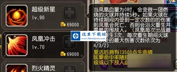 超级新星(普通):当凤凰血量为0时,会变做一团燃烧的火球并持续5秒。如果火球在持续期间内受到一定次数的的伤害则凤凰会死亡,否则会涅槃重生,震晕周围敌人并继续战斗。(一场战斗最多可重生3次,每次重生期间火球可承受的最大伤害次数依次为4/3/2)
