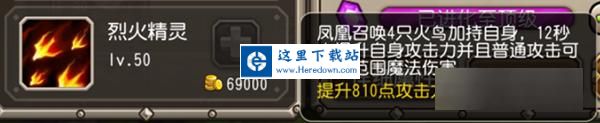 烈火精灵(普通):凤凰召唤4只火鸟加持自身,12秒内提升自身攻击力并且普通攻击可造成范围魔法伤害。