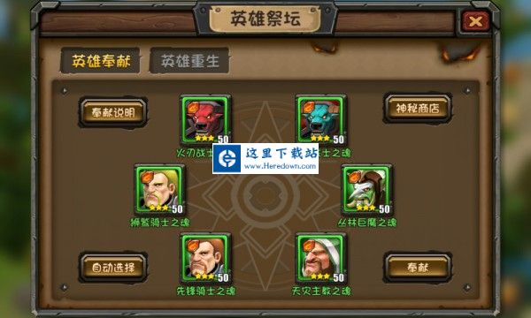 献祭:通过献祭功能,玩家可以将多余的英雄和印记献祭掉,而获得“英雄徽章”的资源。可以利用该资源在“神秘商店“内买到玩家想要的其他道具