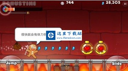 姜饼人酷跑和以往的酷跑游戏不同,血量并非是固定的。即使玩家并没有撞到任何障碍物,但是随着时间的流逝,血量也会缓慢的减少。如果想要更持久的酷跑,那么游戏过程中会随机出现血瓶,玩家要尽量拿到,这个办法比较被动。
