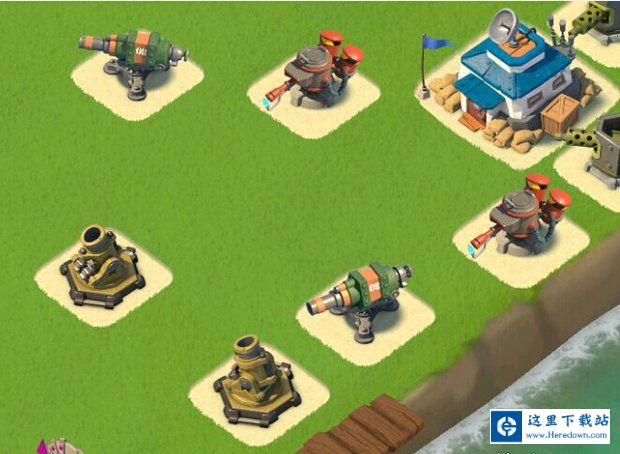 第六个原则,尽量保证一定数量的重机枪靠近基地,但是又不会紧紧的贴住其他重要防御建筑,最好在基地右上角死角处放置1-2个重机枪,它们基本无法被震爆影响,是强大的火力输出(震爆死角处的重机枪会导致部分野人也被震爆,同理,很多高端玩家将震爆火箭炮放在这个位置,但是我个人认为,利弊相差不大的举措,用单个震爆火箭炮放在外围吸引震爆弹也可以为杀伤性武器提供更多输出空间);