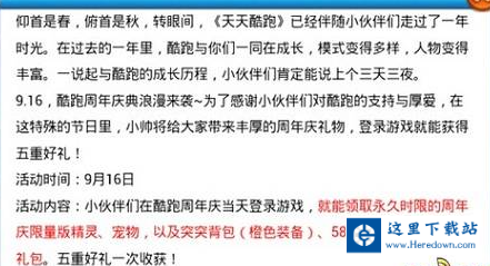 转眼间,天天酷跑已伴随玩家走过一年的时间,道不清的酸甜苦辣一切尽在不言中!9月16日是酷跑周年庆当天,小编提醒大家一定要记得登陆哦,因为登陆就会获得五重好礼。下面是详细介绍!