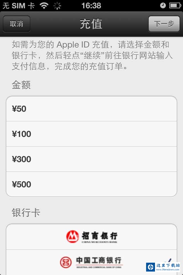 1、进入Apple的“充值”页面;充值面额目前支持:50元,100元,300元 和 500元 !确认充值金额,选定付款银行,“继续”进行;