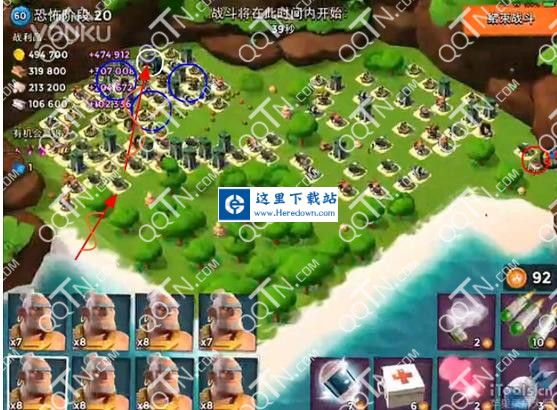 红圈内火炮攻击,野人上岸后使用引导弹引导野人沿着箭头方向前进,直到总部,期间使用烟雾弹,等到烟雾消失,立即在蓝圈内使用震爆弹控制,最后摧毁总部,期间白圈内使用医疗包回复。
