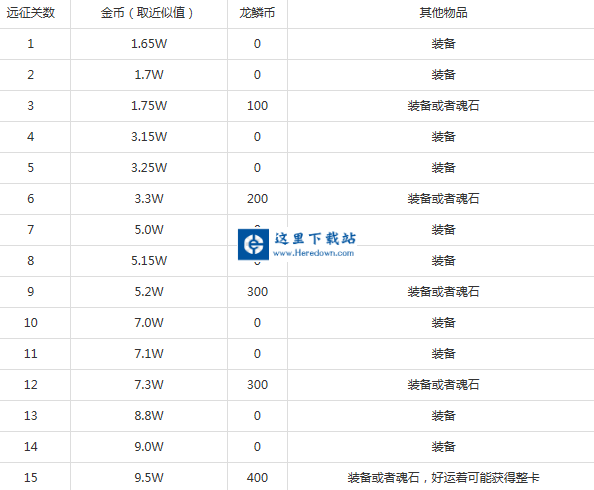 那么打完一次远征可以获得多少龙鳞币呢?小编在这里告诉你,都是在紫色箱子开的,第三关100个,第六关200个,第九关300个,第12关300个,第15关,400个。有实力的同学还可以挑战噩梦难度,要知道噩梦难度奖励可是翻倍的呢,不过噩梦难度要通关并且拥有任意等级的VIP等级才可以开启哦。